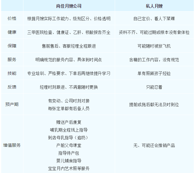 經(jīng)過這次輾轉(zhuǎn)的請月嫂路,我做了張私人月嫂跟公司月嫂的對比表格,可以給其他像我一樣需要請月嫂的家庭做了解