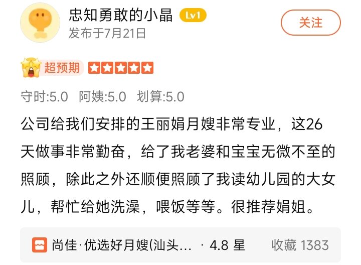 麗娟姐來(lái)自饒平,是地道的潮汕人,因喜歡寶寶加入母嬰護(hù)理行業(yè),擅長(zhǎng)給產(chǎn)婦擦身,按摩,對(duì)于寶寶的護(hù)理,麗娟姐能夠細(xì)致的觀察寶寶的黃疸,紅屁屁等。有多年的護(hù)理經(jīng)驗(yàn),是您月子期的不二選擇。